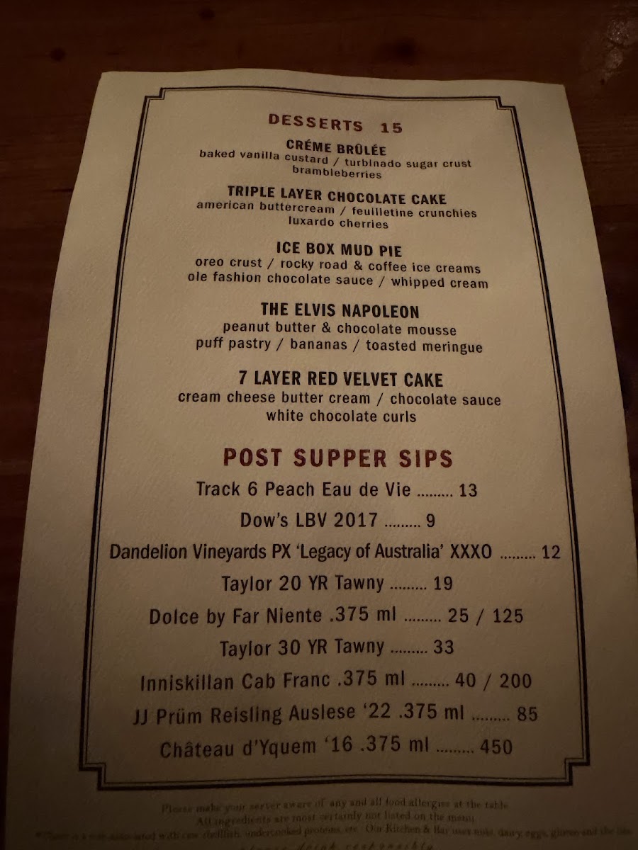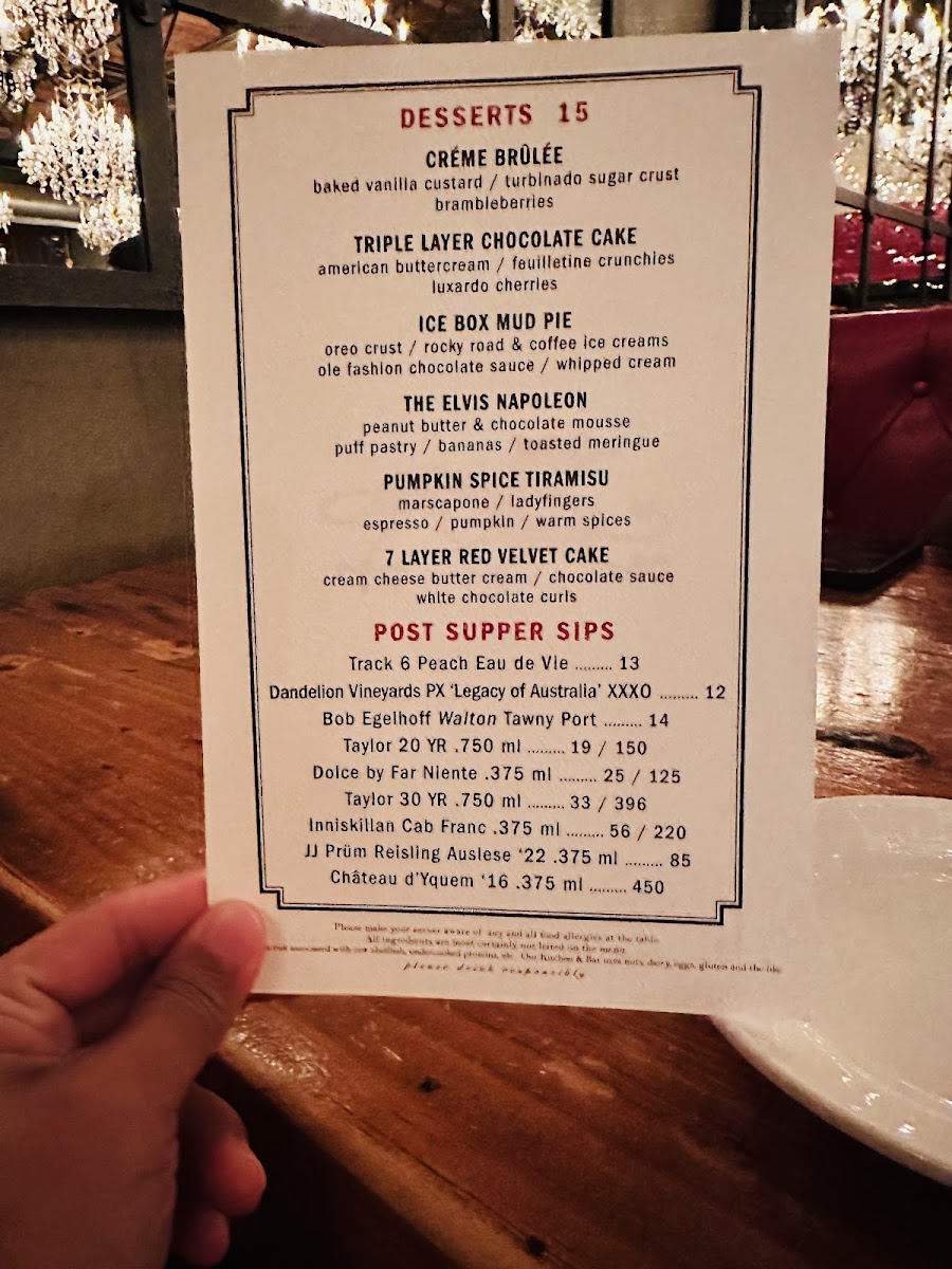 Alongside standout steaks and seafood, desserts like Chocolate Cake with Peanut Butter Chips and Creme Brulee provide a satisfying finish, making the experience feel complete without overwhelming the palate. Overall, the menu encourages a relaxed yet elevated dining experience, inviting guests to enjoy familiar flavors presented with care and subtle creativity.